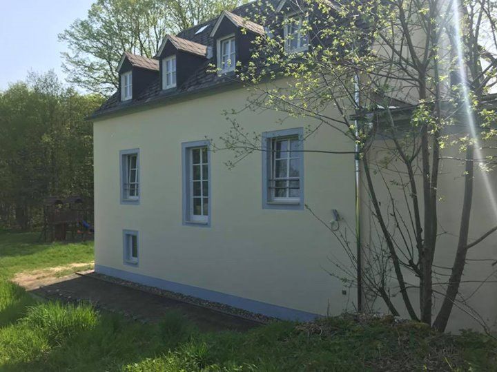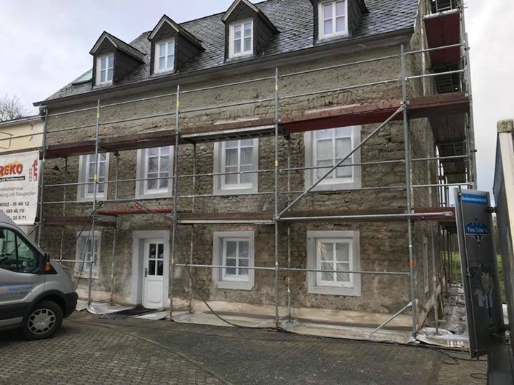The old plaster surfaces were chipped off, the exposed quarry stone wall was cleaned and a mineral plaster system was applied.